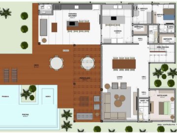 Térreo - 1 suíte, 1 suíte para secretária todas com cama de casal, ar condicionado split, tv smart e armários. Área de lazer com piscina iluminada, cascata e hidromassagem