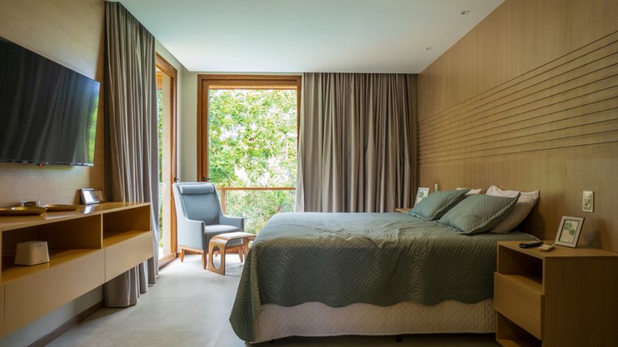 - Suíte 003 (Master): Cama King Size, criado mudo, armários, poltrona, TV LED 50 pol, closet.