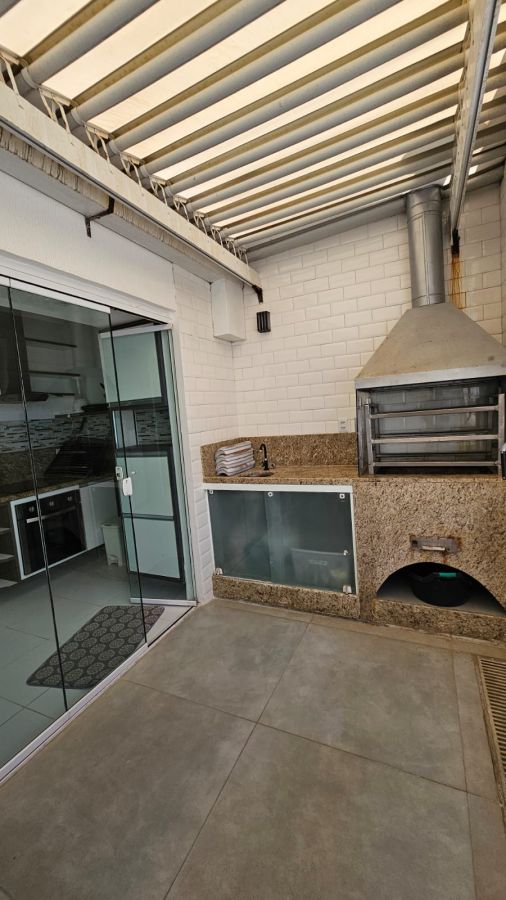 - Amplo terraço com churrasqueira revestida em granito, bancada de apoio com pia e armários planejados sob a bancada.